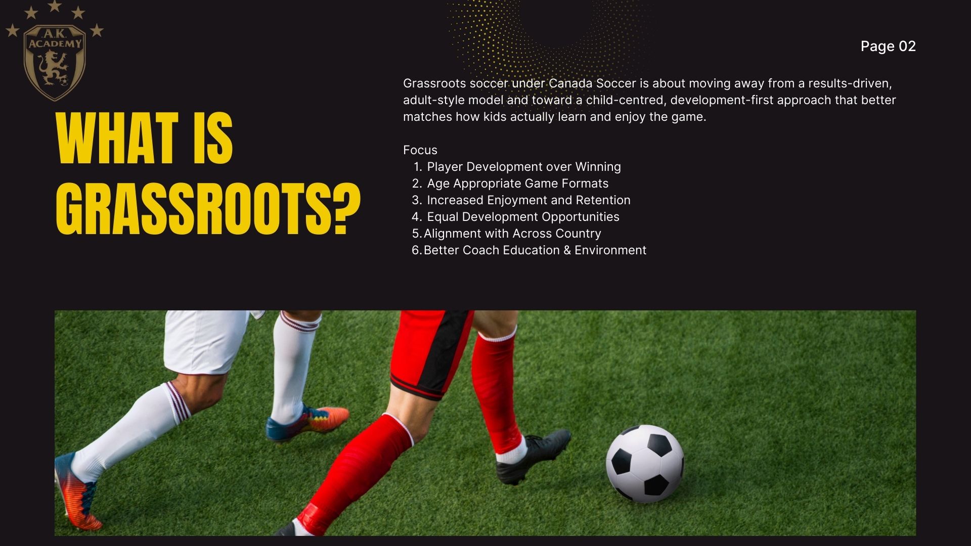 Within our Grassroots program, we focus on creating environments where young players can explore the game, stay active, and develop a love for soccer. Sessions are designed to support the development of fundamental movement skills such as running, jumping, landing, kicking, throwing, and catching, along with essential physical literacy components including agility, balance, coordination, and speed. These elements align with Stage 1: Active Start and Stage 2: FUNdamentals of the Canada Soccer LTPD Pathway.